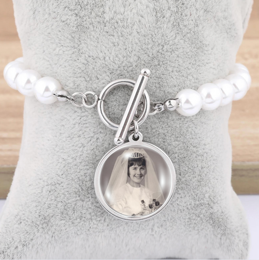 Pearl Bracelet With Photo Charm Wedding memorial photo jewelry